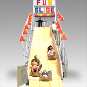 The Fun Slide is a 65' long, 3-lane fiberglass slide that riders slide down on mats suitable for all ages. Children under the age of three years old must accompanied by an adult. Space required is 15' (w) 65 (l) 50' (h) clearance
